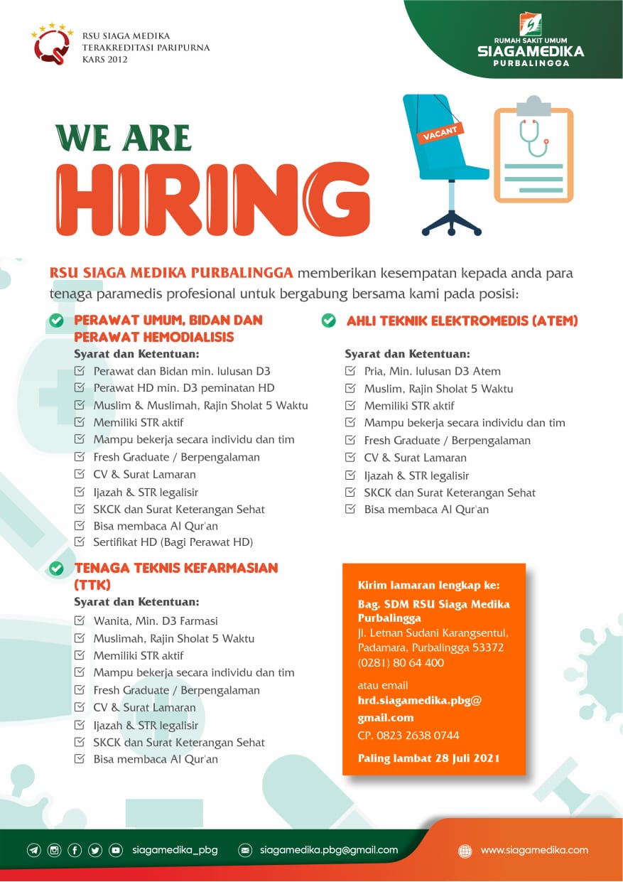 lowongan perawat, bidan, TTK 2021 Lowongan tenaga kesehatan di Rumah Sakit Umum SIAGA MEDIKA Purbalingga lamaran kirim maksimal 28 Juli 2021