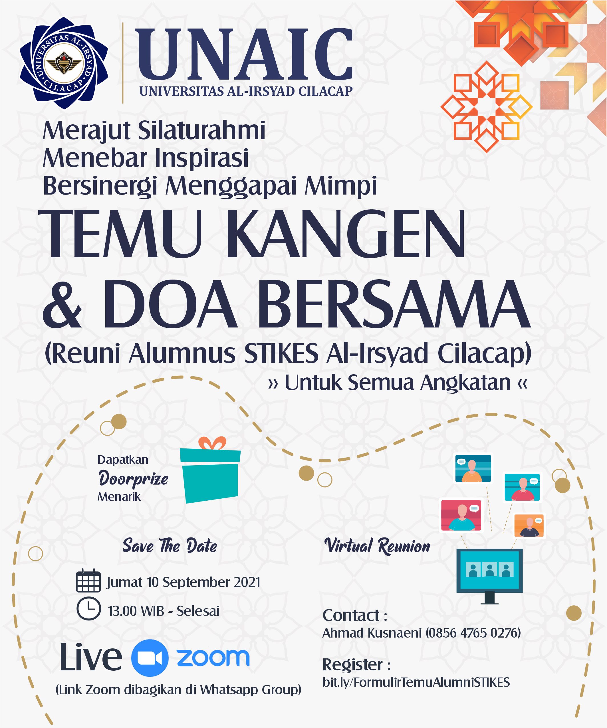 Temu Kangen dan Doa Bersama Sekian tahun kita terpisah oleh jarak dan waktu, akhirnya melebur menjadi satu bernama rindu Merajut Silaturahmi Menebar Inspirasi Bersinergi Menggapai Mimpi Yuk ikuti reuni Alumnus STIKES Al-Irsyad Cilacap (semua angkatan) serta Doa bersama 🗓️ Jumat 10 September 2021 ⏱️ 13.00-Selesai 🔊Live Zoom (link dibagikan di WhatsApp grup) 📝 https://bit.ly/FormulirTemuAlumniSTIKES Cp...
