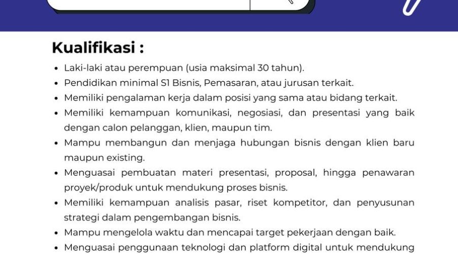 PT Bumi Teknik Semesta sedang mencari individu yang dinamis, komunikatif, dan berorientasi pada target untuk bergabung bersama tim kami sebagai Business Development. Jika Anda memiliki passion dalam membangun hubungan bisnis dan strategi pengembangan pasar, kami mengundang Anda untuk melamar. Kualifikasi Utama: Profil: Laki-laki atau Perempuan (Usia maksimal 30 tahun). Pendidikan: Minimal lulusan S1 jurusan Bisnis,...