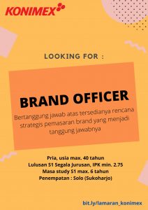 Konimex sedang mencari kamu untuk mengisi posisi Brand Officer, diprioritaskan memiliki pengalaman memegang sebuah brand/ Marketing, kreatif, dan mampu berpikir strategis.