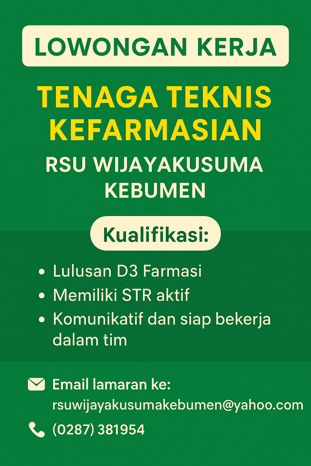 Rumah Sakit Umum Wijayakusuma Kebumen membuka lowongan kerja untuk posisi Tenaga Teknis Kefarmasian (TTK).