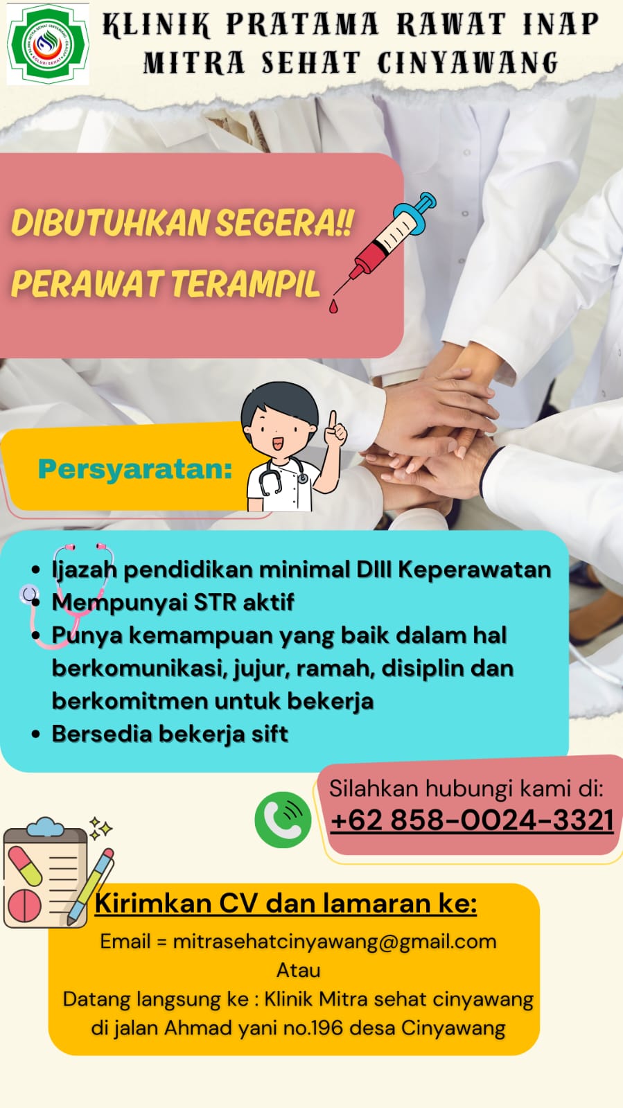 Klinik Pratama Rawat Inap Mitra Sehat Cinyawang membuka kesempatan berkarir bagi perawat terampil dengan kualifikasi minimal DIII Keperawatan dan STR aktif. Klinik ini mengutamakan tenaga kesehatan yang memiliki kemampuan komunikasi yang baik, jujur, ramah, disiplin, dan berkomitmen tinggi dalam bekerja. Bersedia bekerja sift menjadi salah satu syarat utama.
