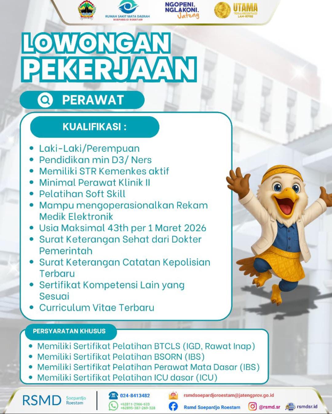 Rumah Sakit Mata Daerah (RSMD) Soepardjo Roestam membuka kesempatan bagi tenaga kesehatan profesional, berdedikasi, dan memiliki integritas tinggi untuk bergabung bersama kami melalui rekrutmen Tenaga Perawat Tahun 2026.