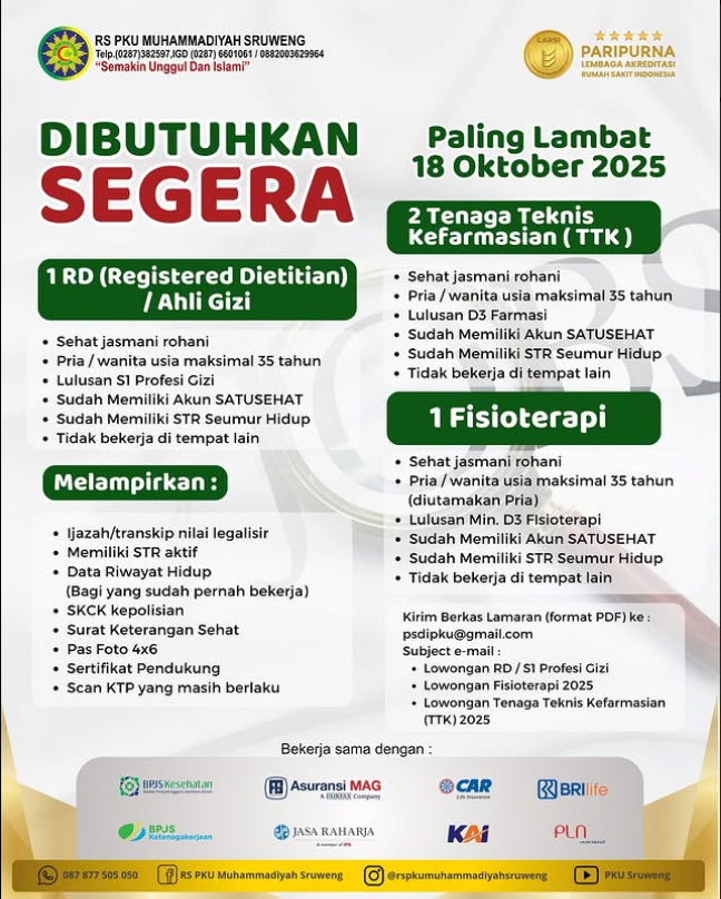 RS PKU Muhammadiyah Sruweng membuka kesempatan bagi tenaga kesehatan profesional untuk bergabung dalam pelayanan kesehatan Islami dan berintegritas tinggi.
