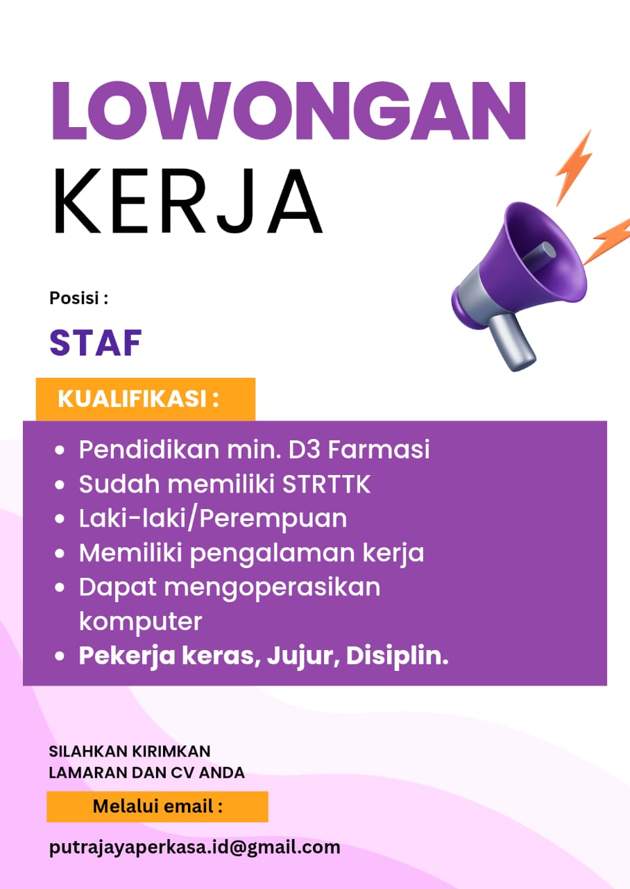 PT Putra Jaya Perkasa membuka kesempatan bagi lulusan D3 Farmasi untuk bergabung sebagai Staf.