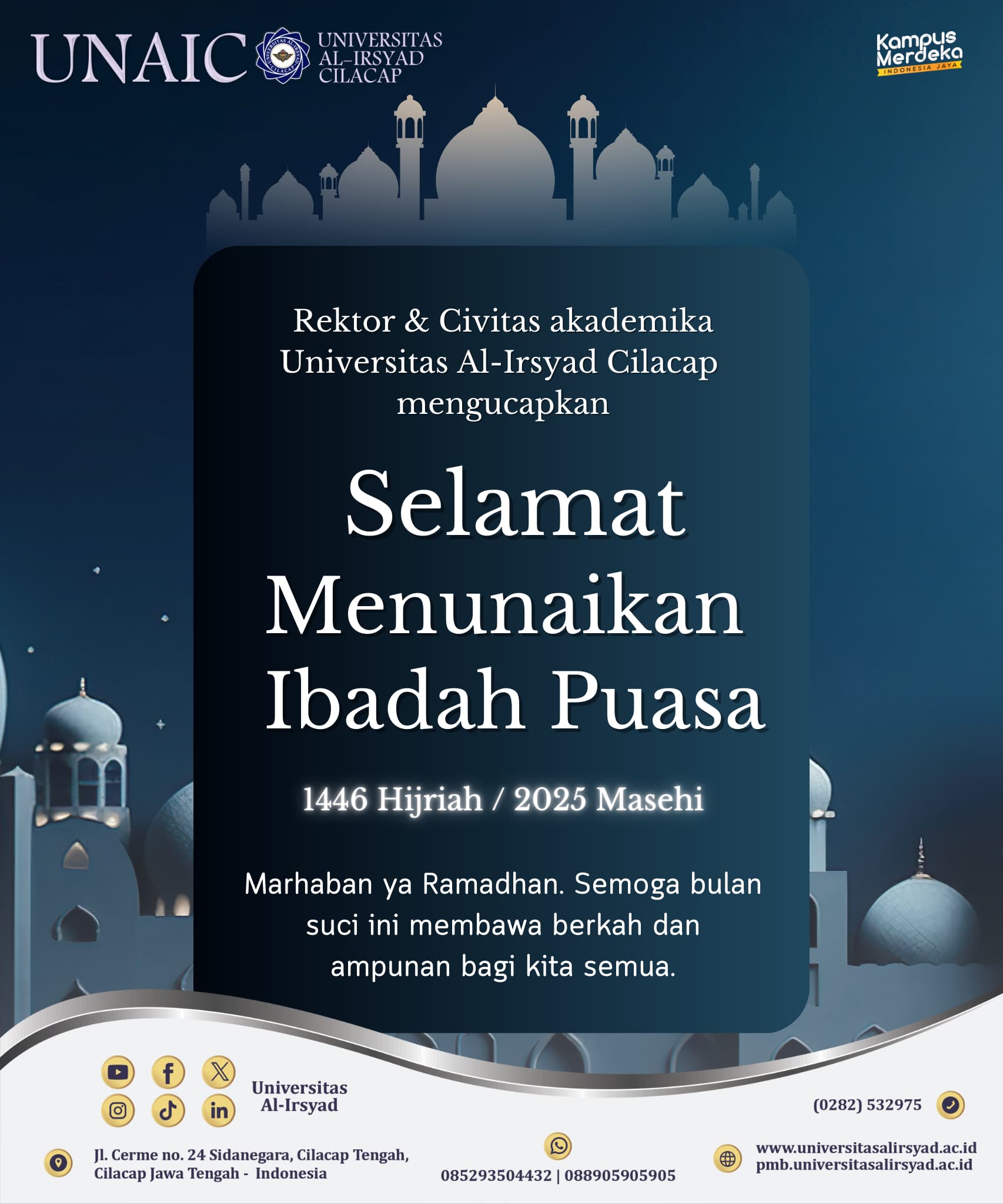 Rektor dan segenap civitas akademika Universitas Al Irsyad Cilacap mengucapkan Selamat Menunaikan Ibadah Puasa.