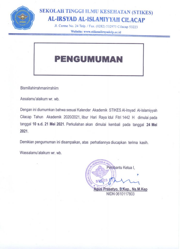 Pengumuman Libur Idul Fitri 2021 STIKES Al-Irsyad Al-Islamiyyah Cilacap