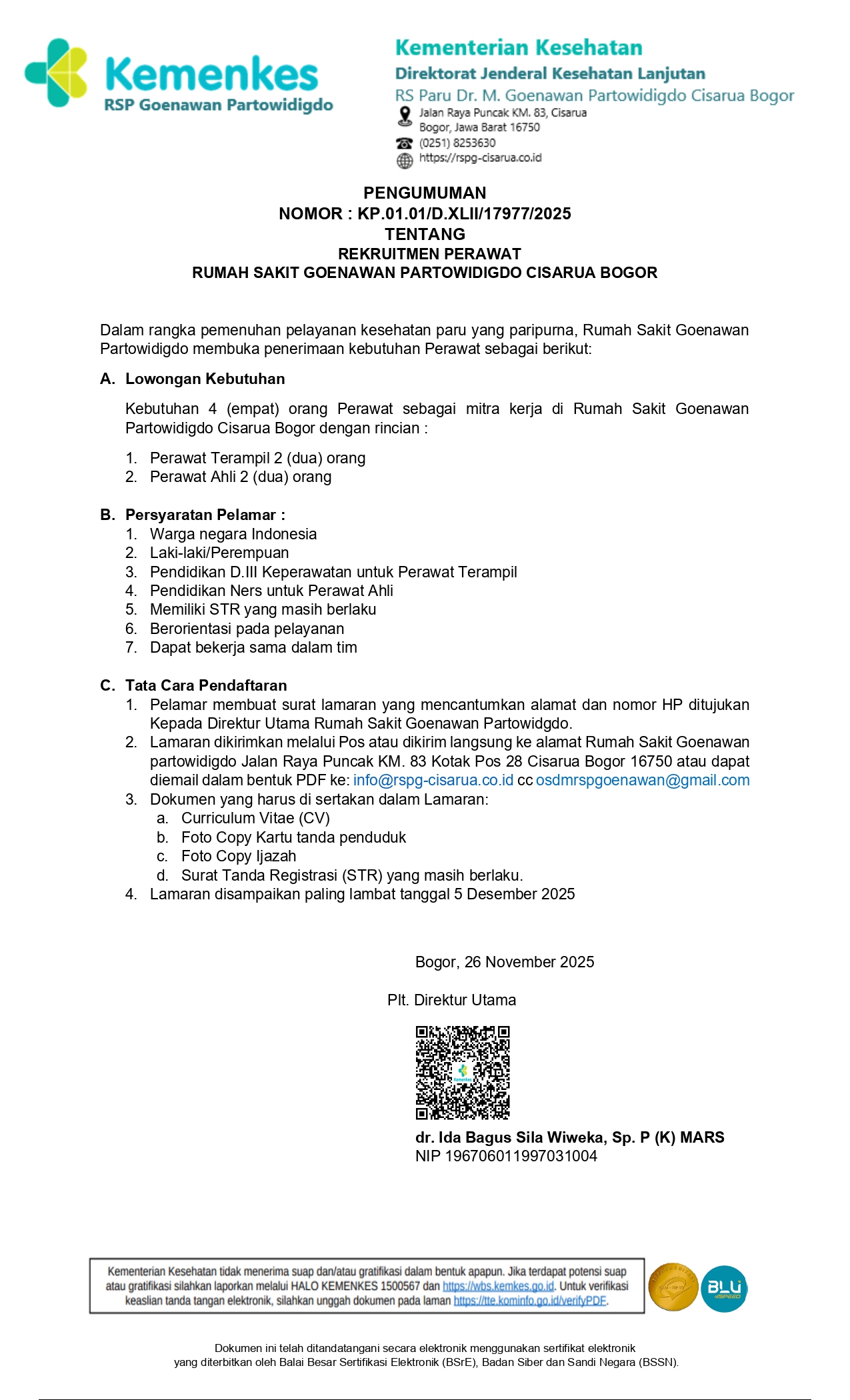REKRUITMEN PERAWAT RUMAH SAKIT GOENAWAN PARTOWIDIGDO CISARUA BOGOR