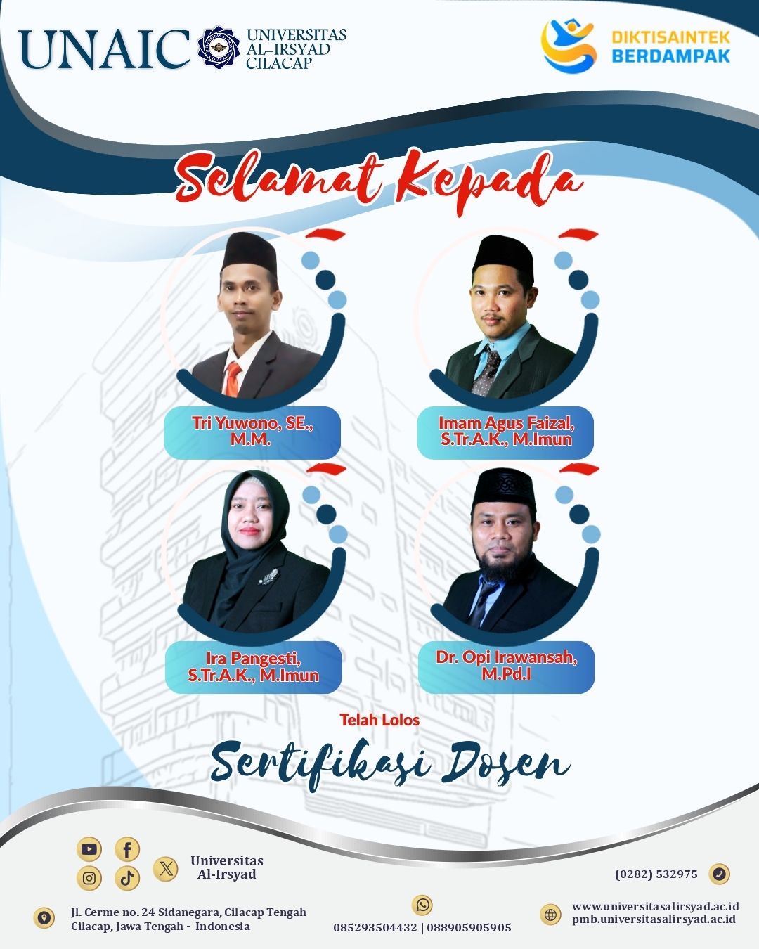 Universitas Al-Irsyad Cilacap mengucapkan selamat dan sukses kepada dosen-dosen yang telah berhasil lolos Sertifikasi Dosen Tahun 2025.