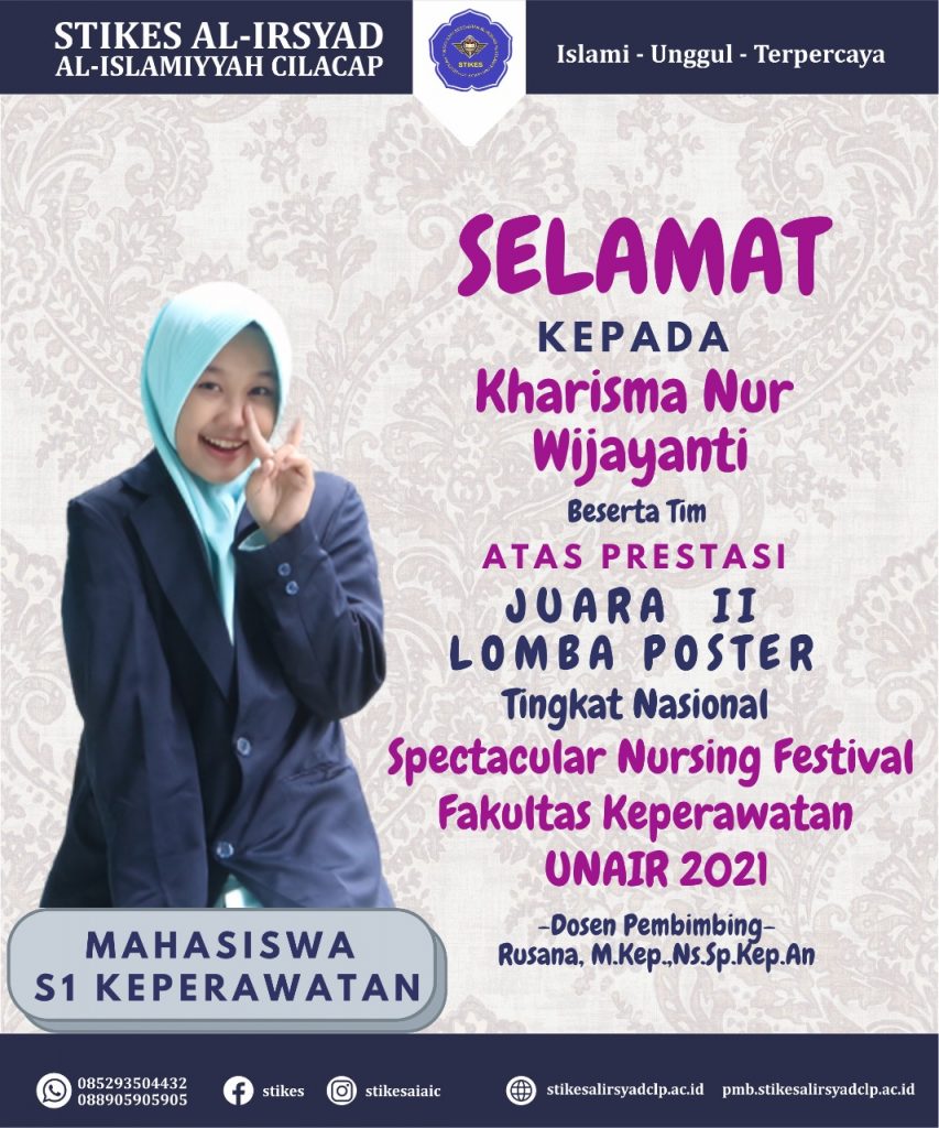 Selamat kepada Kharisma Nur Wijayanti dan Rizka Ade Pratiwi Mahasiswa Program Studi S1 Keperawatan Stikes Al-Irsyad Cilacap atas prestasi juara II lomba poster tingkat Nasional yang diselenggarakan oleh Fakultas Keperawatan Universitas Airlangga tahun 2021