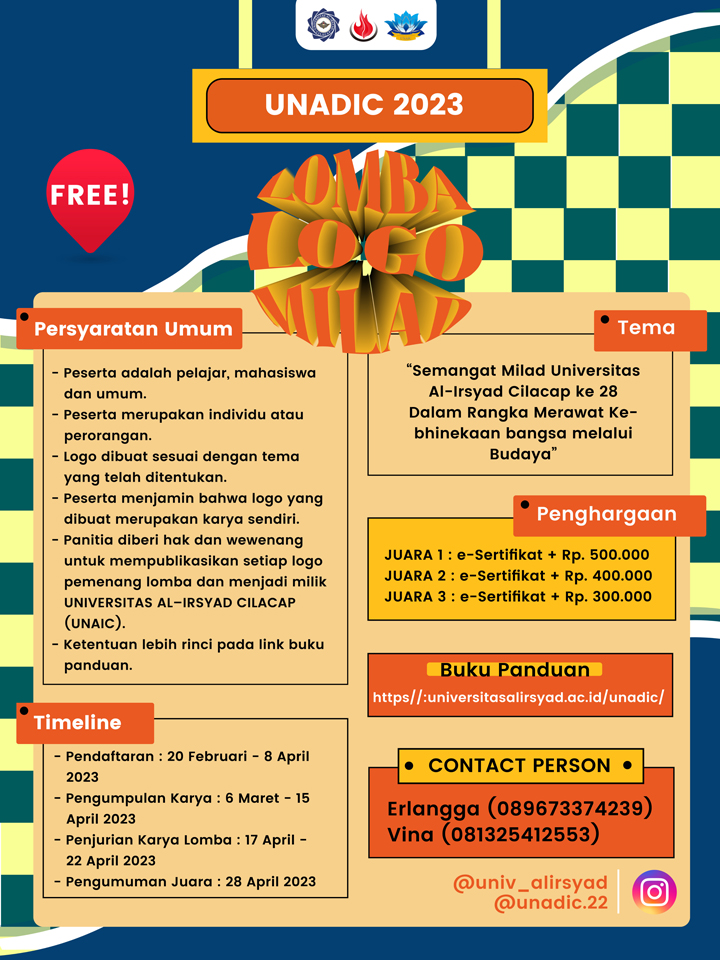 UNADIC’23 merupakan Kompetisi tingkat nasional yang diselenggarakan oleh Universitas Al-Irsyad Cilacap dan Badan Eksekutif Mahasiswa (BEM) Universitas Al-Irsyad Cilacap