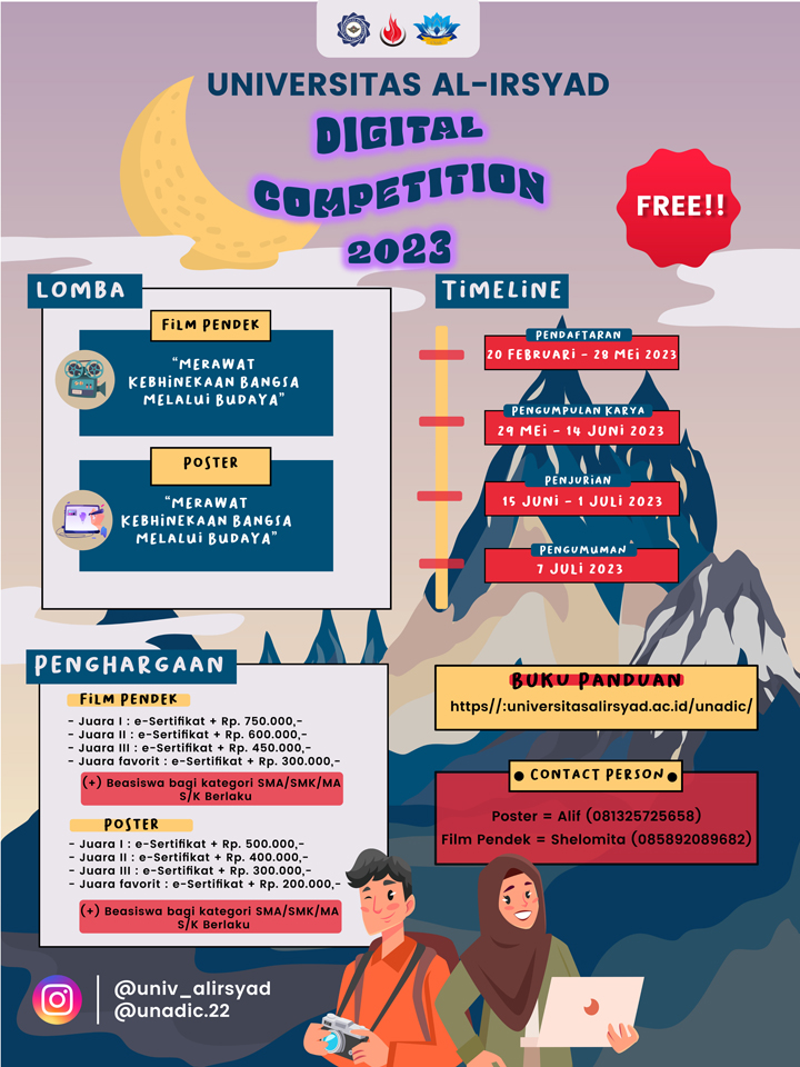 Mengusung tema “Merawat Kebhinekaan Bangsa Melalui Budaya”. Yuk tuangkan ide hebatmu dalam “UNADIC’23” UNIVERSITAS AL-IRSYAD DIGITAL COMPETITION